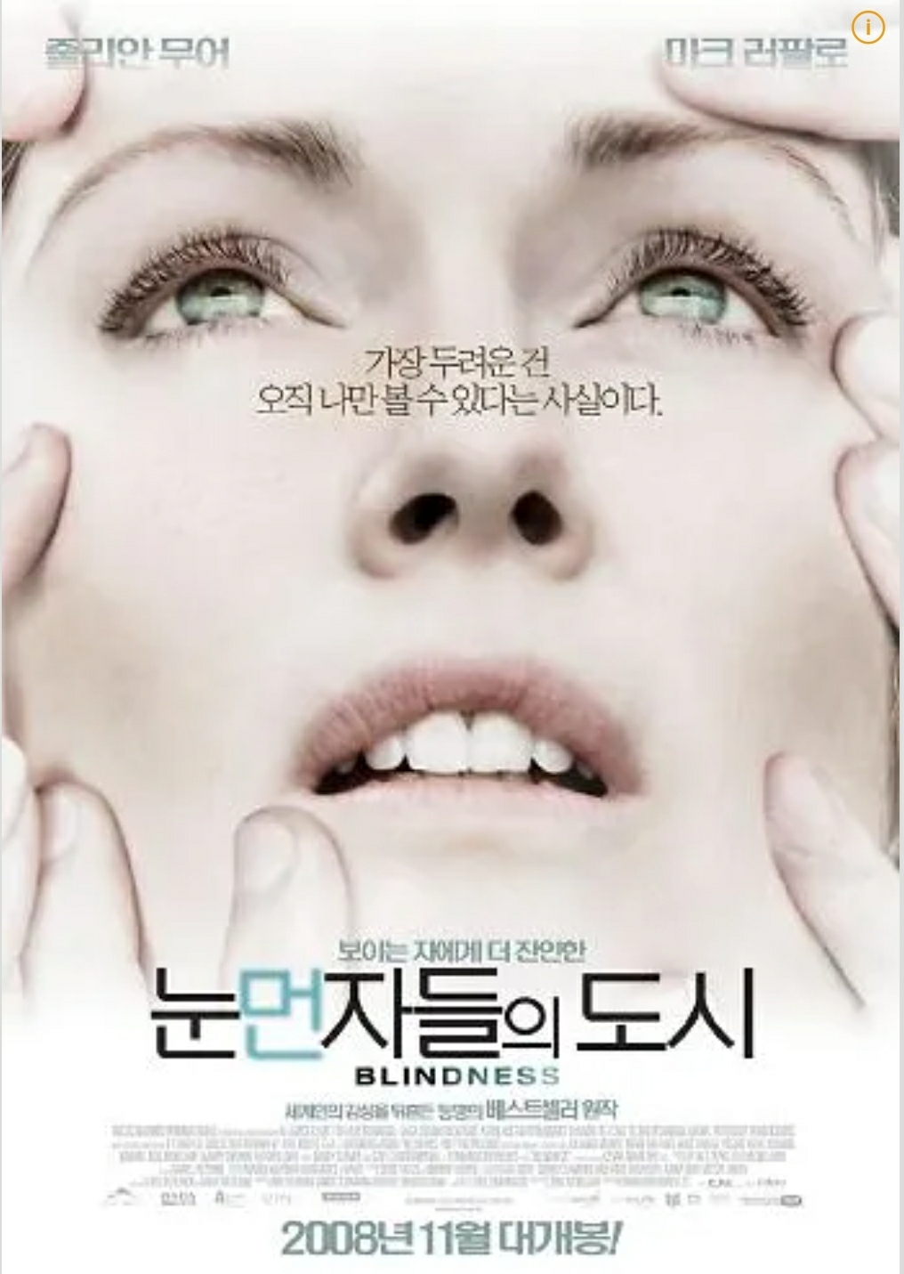 중심인물 중 하나는 실명하지 않은 여성(줄리안 무어 분)입니다. 그녀는 실명한 남편(마크 러팔로 분)을 따라 격리 시설로 들어가지만, 자신이 보는 능력이 있다는 사실을 숨깁니다. 영화는 이 여성의 눈을 통해 격리된 사람들의 생활, 그들 사이의 갈등, 그리고 인간성의 상실과 회복을 그려냅니다.